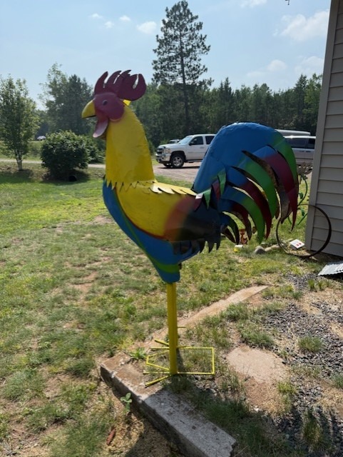 Yellow and blue yard art rooster